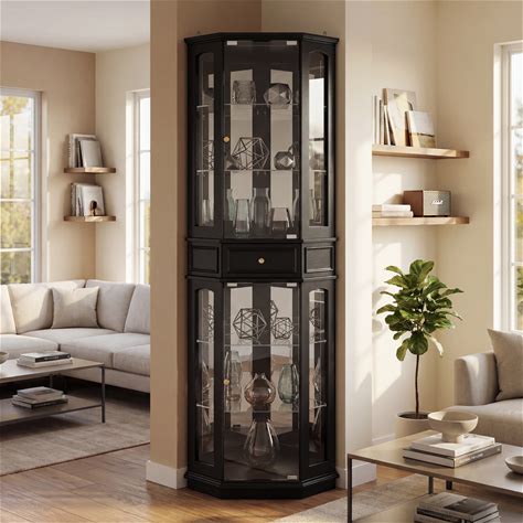 Tall Corner Curio Cabinet With LED 77.5'' Black Corner Display Cabinet Glass Display Case China, Wine & Decor Storage