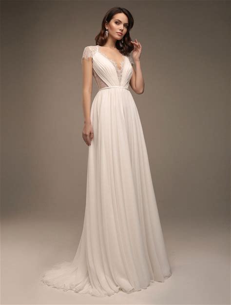 Lace Decorations Wedding Maxi Dress With Train, Greek Style Dress, Lace Sleeves And Semi-Transparent Back With Buttons, Modern Wedding Dress