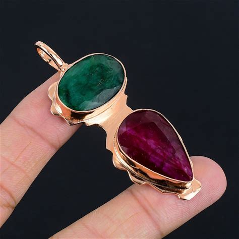 Ruby & Emerald Pendant, Emerald And Ruby Gemstone Jewelry, Pure Copper Pendant, Handmade Chain Pendant, Birthday And Christmas Gift For Her