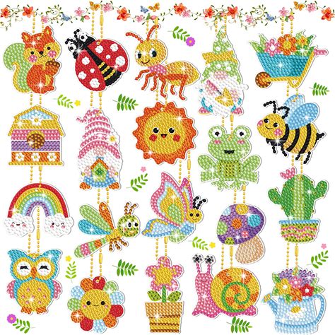 Inbagi 20 Pcs Spring Diamond Painting Kits Diamond Art Keychain 5D DIY Painting Tags Flower Insect Animal Bee Frog Crafts Ornaments Hanging Spring